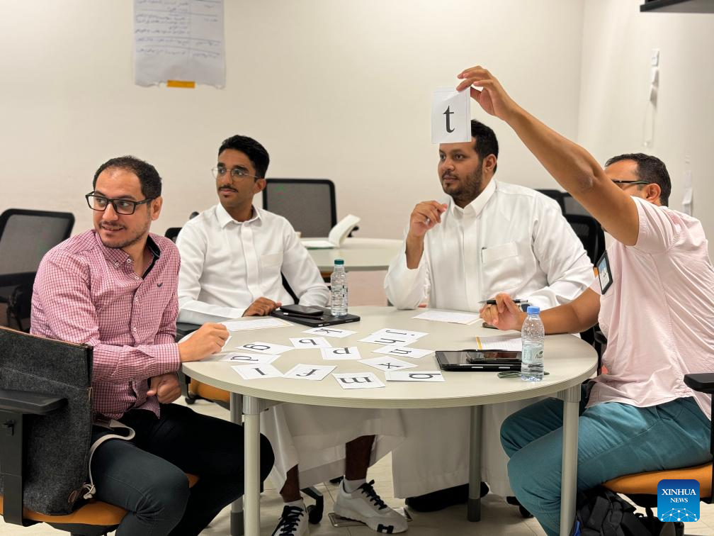 Estudantes sauditas no Instituto Confúcio da Universidade Prince Sultan aprendem Pinyin (alfabeto chinês) em Riad, Arábia Saudita, no dia 7 de setembro de 2024. (Xinhua/Wang Haizhou)