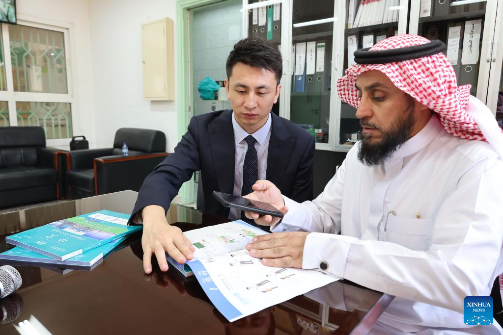 Professor de chinês Shi Xiao conversa com Ghrmallh Al Zahrani, diretor da Escola Fundamental Al Waleed bin Ubadah, em Riad, Arábia Saudita, 5 de setembro de 2024. (Xinhua/Wang Haizhou)