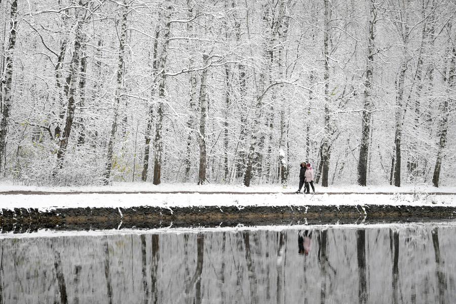 Pessoas caminham em parque coberto de neve em Moscou, Rússia, no dia 4 de novembro de 2024. (Foto por Alexander Zemlianichenko Jr/Xinhua)