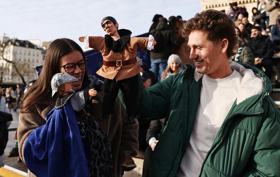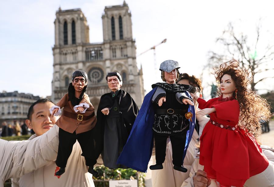 Artistas chineses apresentam uma peça teatral de fantoches “Notre-Dame de Paris” em frente à catedral de Notre-Dame de Paris, em Paris, França, em 15 de dezembro de 2024. (Xinhua/Gao Jing)