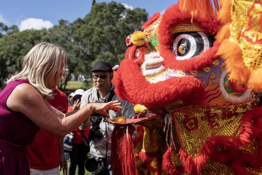 Turista interage com dançarino de leão em evento comemorativo do Ano Novo Lunar Chinês, ou Festa da Primavera, em Auckland, Nova Zelândia, no dia 8 de fevereiro de 2025. (Foto por Wu Jiaxiang/Xinhua)