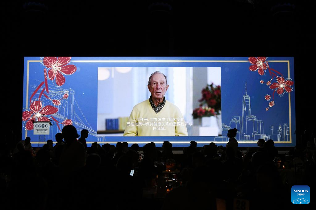 Michael R. Bloomberg, fundador da Bloomberg LP e da Bloomberg Philanthropies e ex-prefeito de Nova York por três mandatos, envia mensagem especial por vídeo parabenizando a Câmara Geral de Comércio da China-EUA (CGCC) em seu 20º aniversário na cidade de Nova York, Estados Unidos, no dia 11 de fevereiro de 2025. Marcando duas décadas de incentivo à cooperação econômica, a CGCC e a Fundação da CGCC sediaram um grande evento do 20º aniversário na cidade de Nova York na terça-feira.