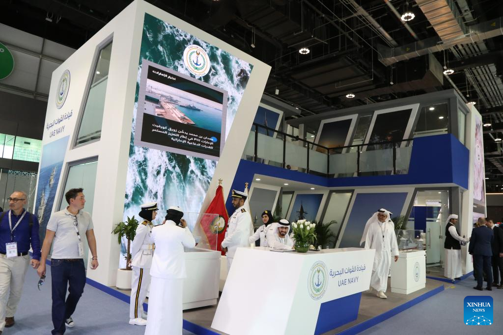 Foto tirada em 17 de fevereiro de 2025 mostra o estande da marinha dos Emirados Árabes Unidos (EAU) na Exposição e Conferência Internacional de Defesa 2025 em Abu Dhabi, nos Emirados Árabes Unidos (EAU). A Exposição e Conferência Internacional de Defesa 2025 em andamento, juntamente com a Exposição de Defesa Naval e Segurança Marítima, é realizada na capital dos Emirados Árabes Unidos (EAU). O evento atraiu 1.565 empresas de defesa de 65 países para apresentar as mais recentes tecnologias e soluções de defesa destinadas a promover a paz e a segurança internacionais, e ocorrerá até 21 de fevereiro.. (Xinhua/Wen Xinnian)
