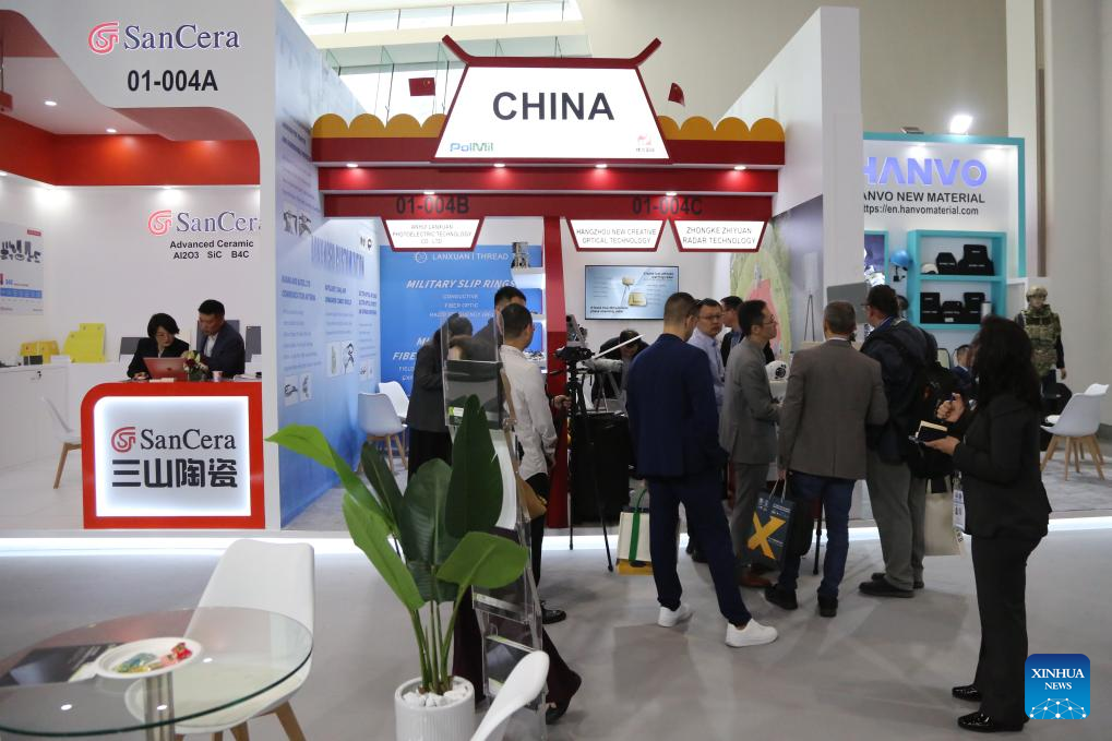 Foto tirada em 17 de fevereiro de 2025 mostra o estande da China na Exposição e Conferência Internacional de Defesa 2025 em Abu Dhabi, nos Emirados Árabes Unidos (EAU). A Exposição e Conferência Internacional de Defesa 2025 em andamento, juntamente com a Exposição de Defesa Naval e Segurança Marítima, é realizada na capital dos Emirados Árabes Unidos (EAU). O evento atraiu 1.565 empresas de defesa de 65 países para apresentar as mais recentes tecnologias e soluções de defesa destinadas a promover a paz e a segurança internacionais, e ocorrerá até 21 de fevereiro. (Xinhua/Wen Xinnian)