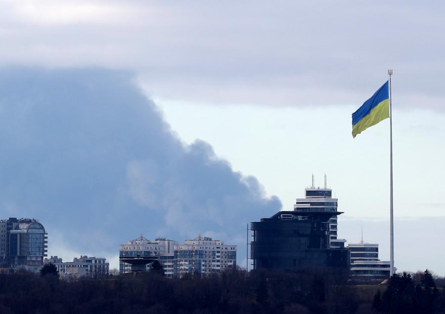 Foto tirada em 27 de fevereiro de 2022 mostra fumaça subindo no céu em Kiev, na Ucrânia. (Xinhua/Lu Jinbo)