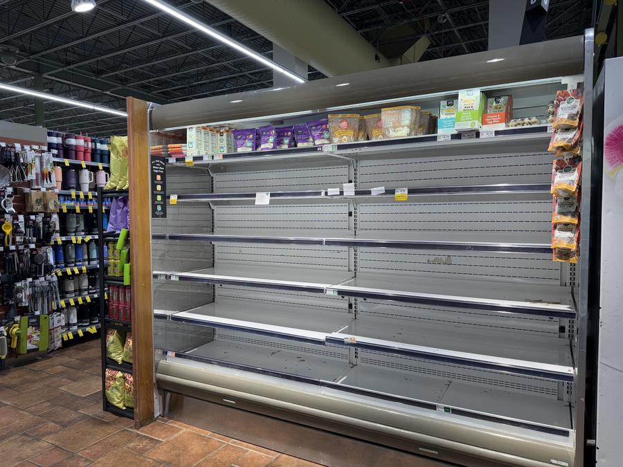 Foto tirada em 14 de janeiro de 2025 mostra uma prateleira de ovos vazia em um supermercado em Arlington, nos Estados Unidos. (Xinhua/Xiong Maoling)