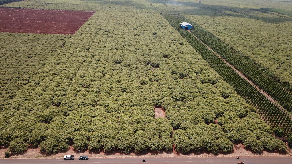 Foto aérea de drone tirada em 4 de março de 2025 mostra plantação de cajus na província de Kampong Thom, Camboja. (Foto por Van Pov/Xinhua)