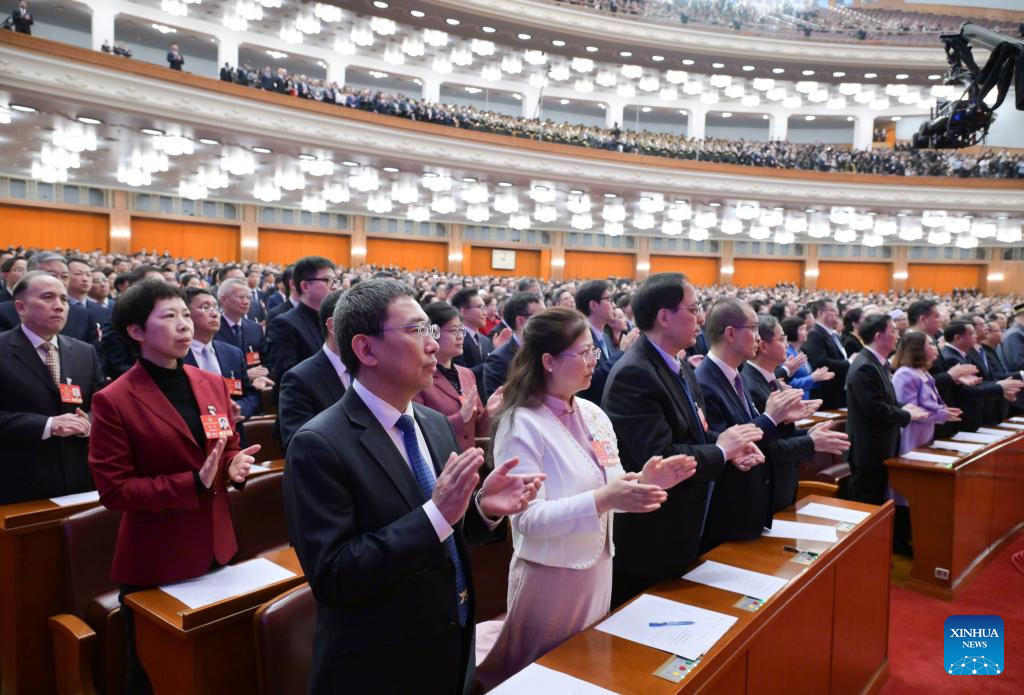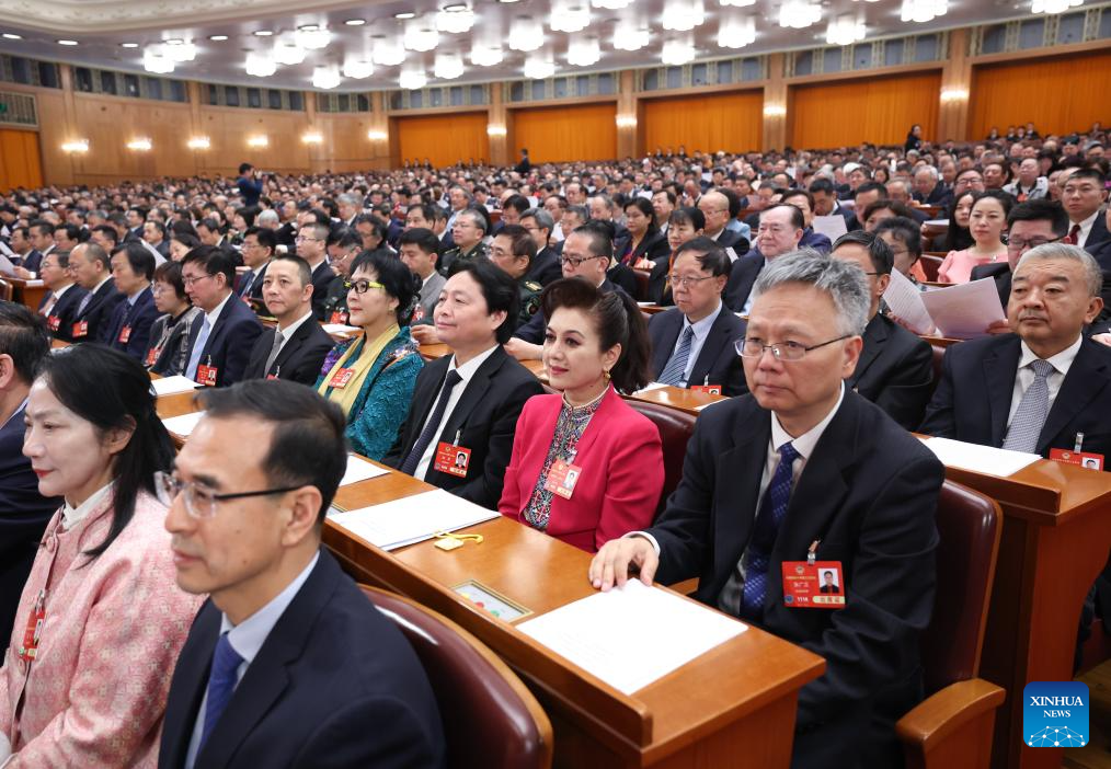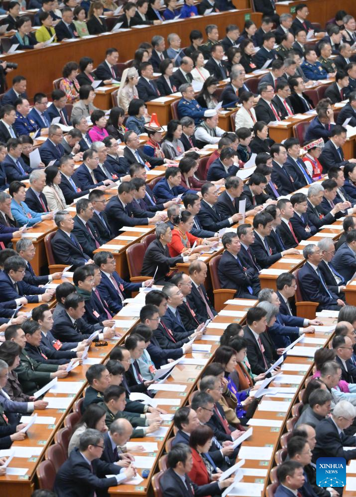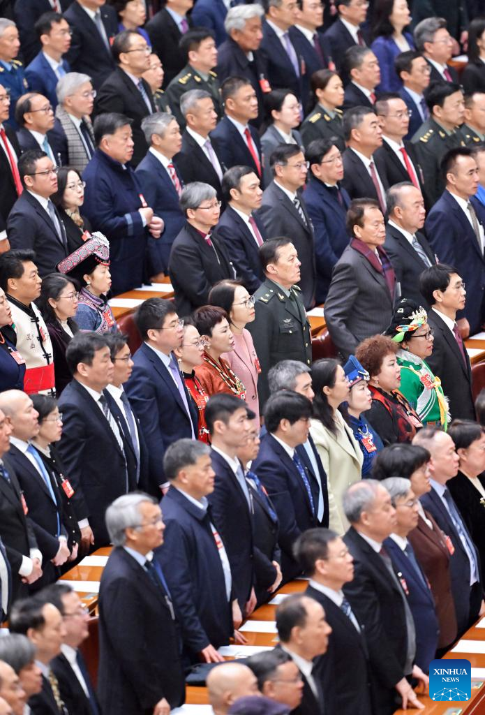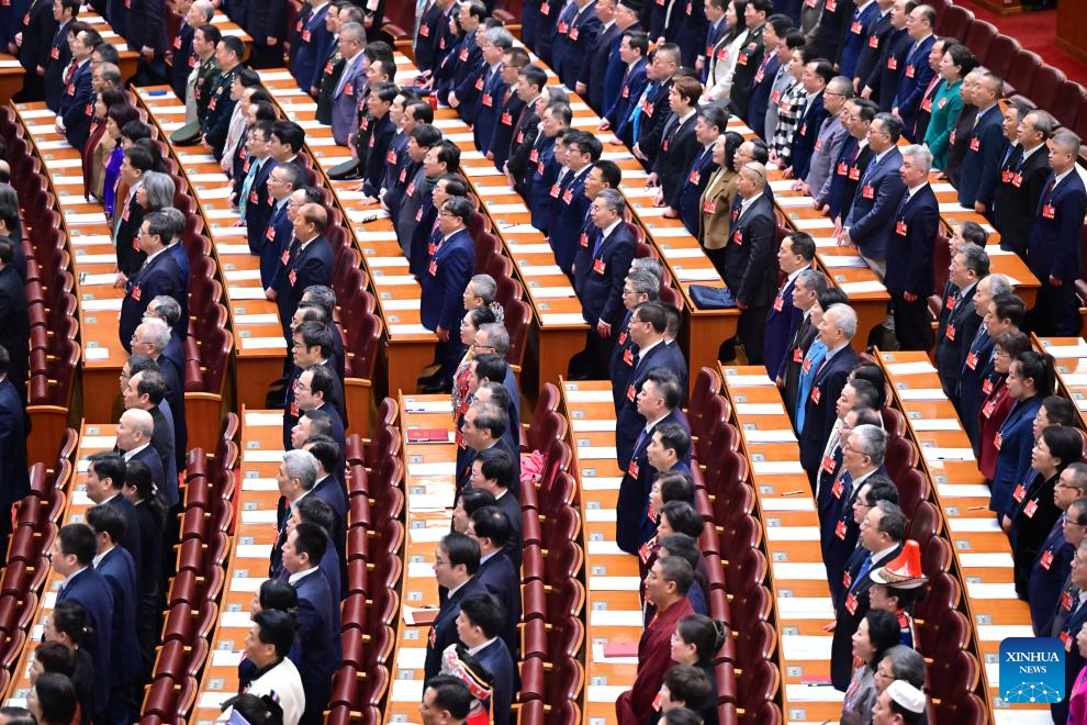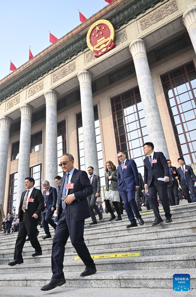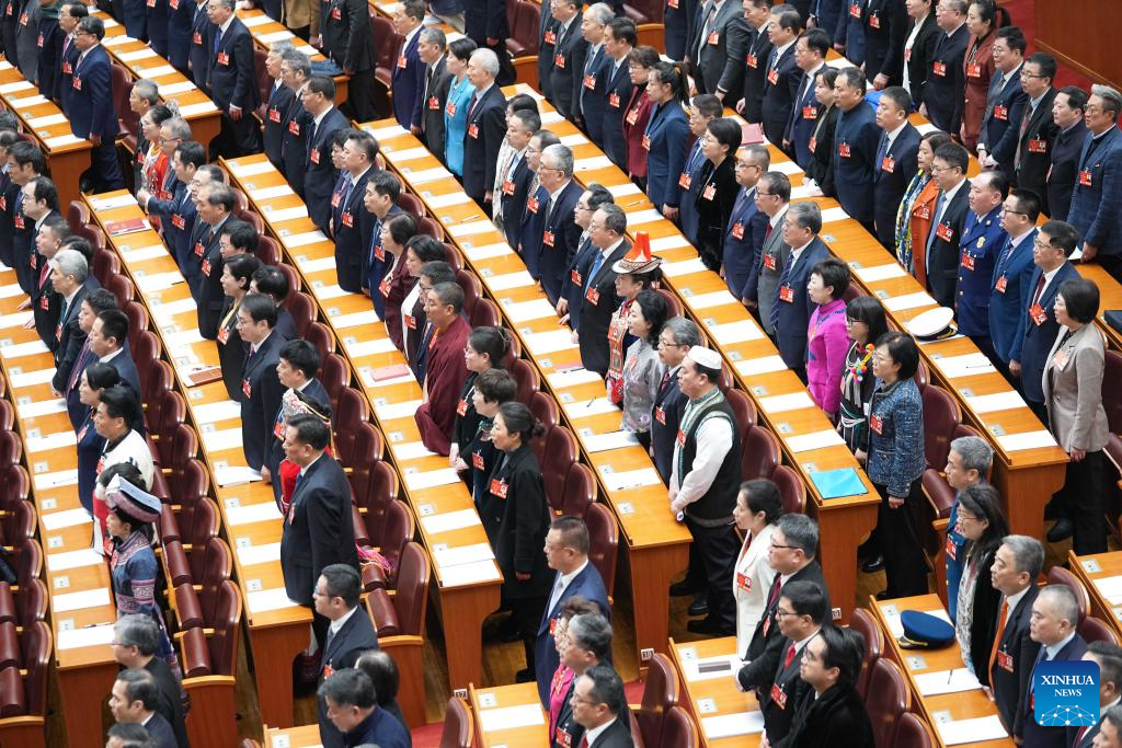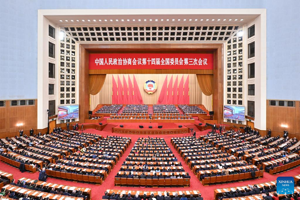 O presidente chinês, Xi Jinping, e outros líderes, incluindo Li Qiang, Cai Qi, Ding Xuexiang, Li Xi e Han Zheng, participaram da reunião de encerramento da terceira sessão do 14º Comitê Nacional da Conferência Consultiva Política do Povo Chinês (CCPPC), realizada no Grande Palácio do Povo, em Beijing.