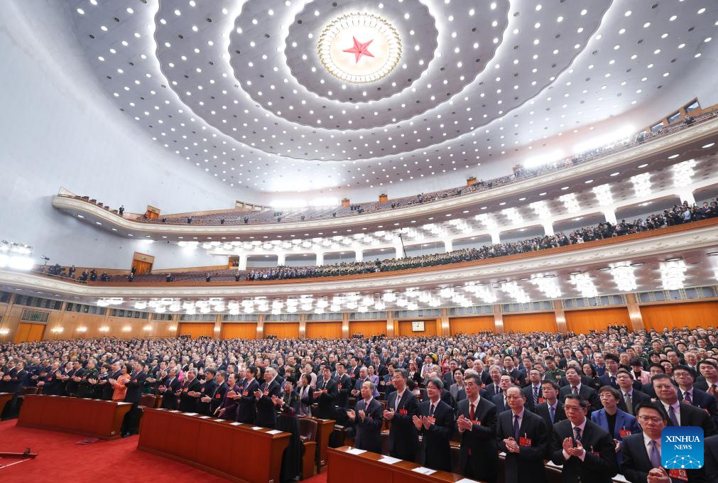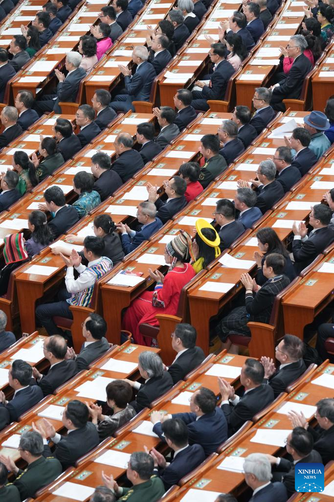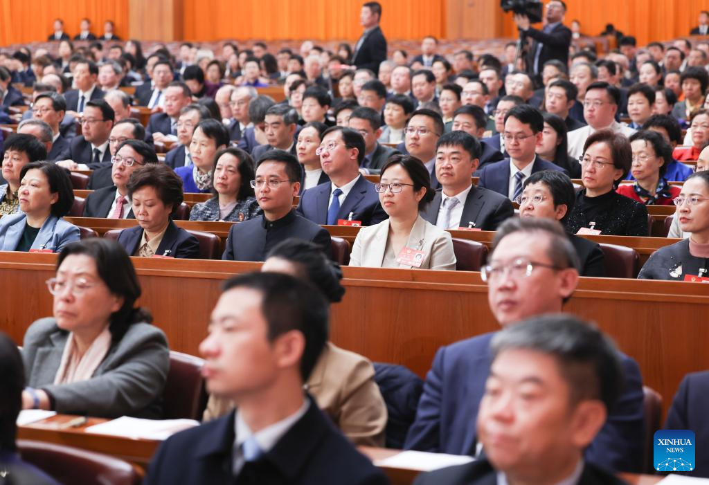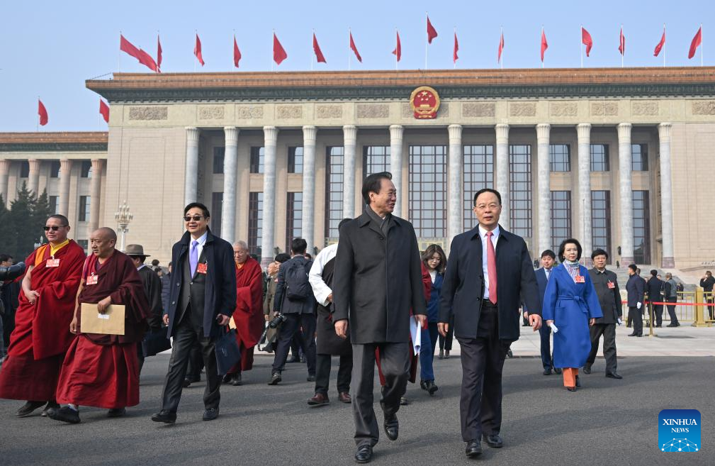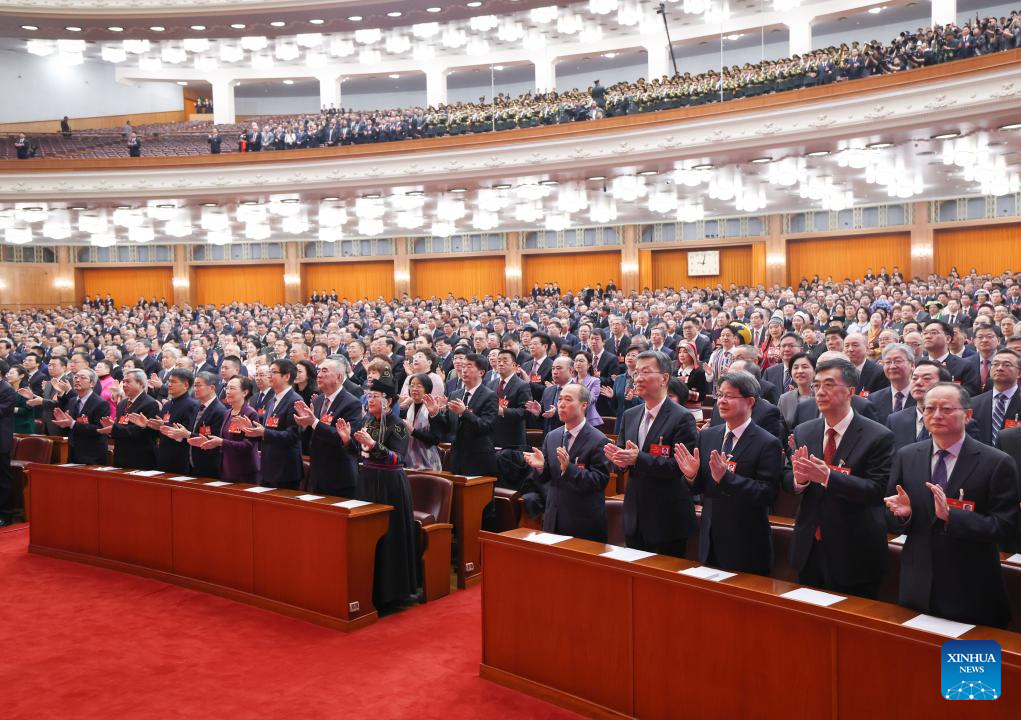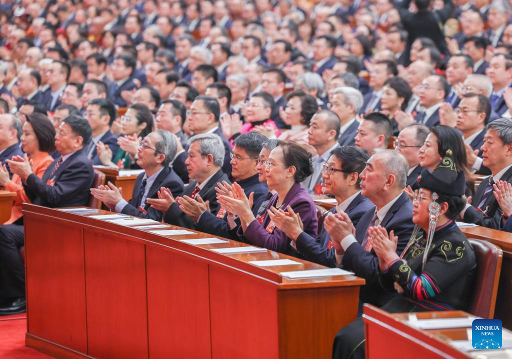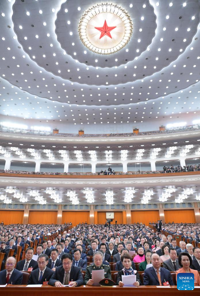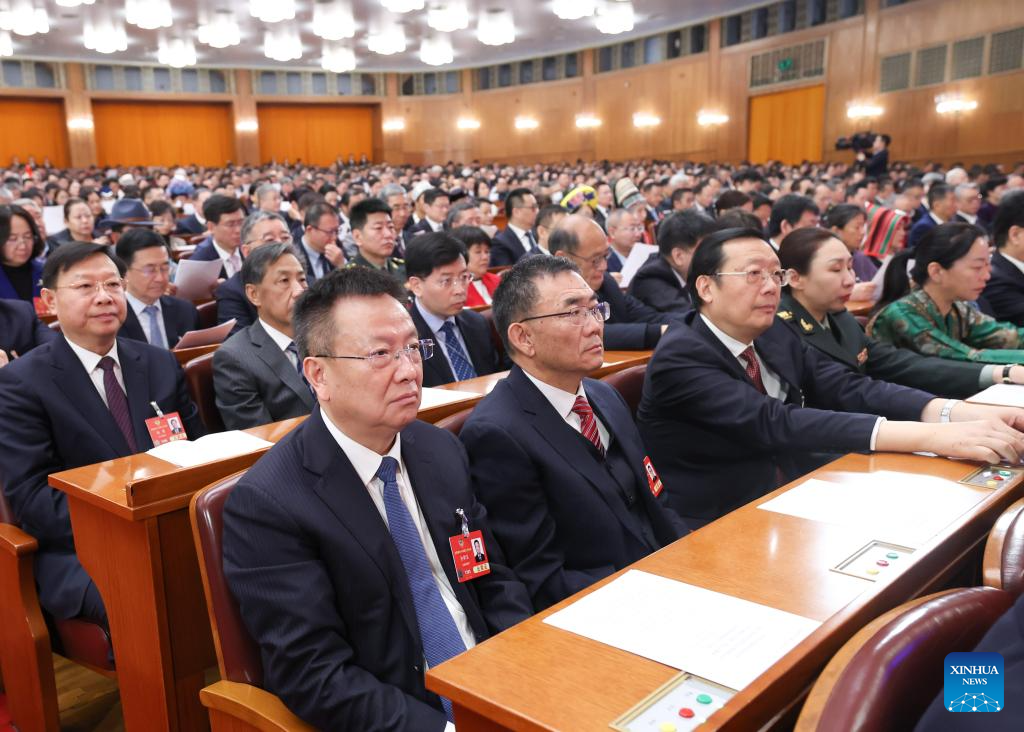 O presidente chinês, Xi Jinping, e outros líderes, incluindo Li Qiang, Cai Qi, Ding Xuexiang, Li Xi e Han Zheng, participaram da reunião de encerramento da terceira sessão do 14º Comitê Nacional da Conferência Consultiva Política do Povo Chinês (CCPPC), realizada no Grande Palácio do Povo, em Beijing.
