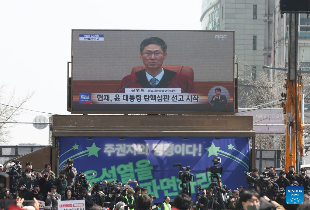 Pessoas assistem à transmissão ao vivo da decisão sobre impeachment do presidente Yoon Suk-yeol pelo tribunal constitucional da Coreia do Sul em Seul, Coreia do Sul, no dia 4 de abril de 2025. O presidente da Coreia do Sul, Yoon Suk-yeol, foi deposto do cargo na sexta-feira enquanto o tribunal constitucional mantinha uma moção do parlamento para impeachment de Yoon por sua curta imposição da lei marcial em dezembro passado. Moon Hyung-bae, chefe interino do tribunal, leu a decisão sobre o impeachment de Yoon, que foi transmitida ao vivo para todo o país, dizendo que a decisão dos oito juízes foi unânime. (Xinhua/Yao Qilin)