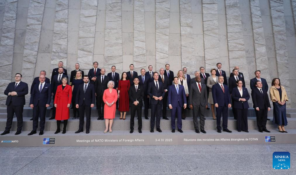 Participantes posam para foto de grupo durante reunião de ministros das Relações Exteriores da Organização do Tratado do Atlântico Norte (OTAN) na sede da OTAN em Bruxelas, Bélgica, no dia 3 de abril de 2025. (Xinhua/Zhao Dingzhe)
