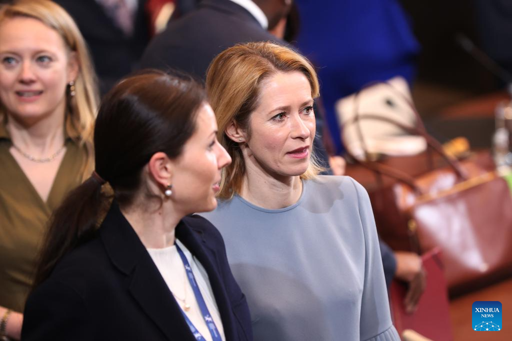 A alta representante da União Europeia para as Relações Exteriores e Política de Segurança, Kaja Kallas (direita), chega para reunião de ministros das Relações Exteriores da OTAN na sede da OTAN em Bruxelas, Bélgica, no dia 4 de abril de 2025. (Xinhua/Zhao Dingzhe)