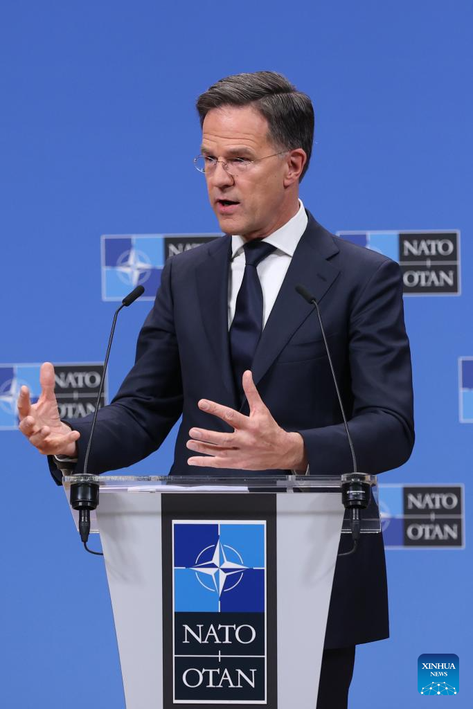 O secretário-geral da Organização do Tratado do Atlântico Norte (OTAN), Mark Rutte, fala durante coletiva de imprensa após uma reunião de ministros das Relações Exteriores da OTAN na sede da OTAN em Bruxelas, Bélgica, em 4 de abril de 2025. (Xinhua/Zhao Dingzhe)