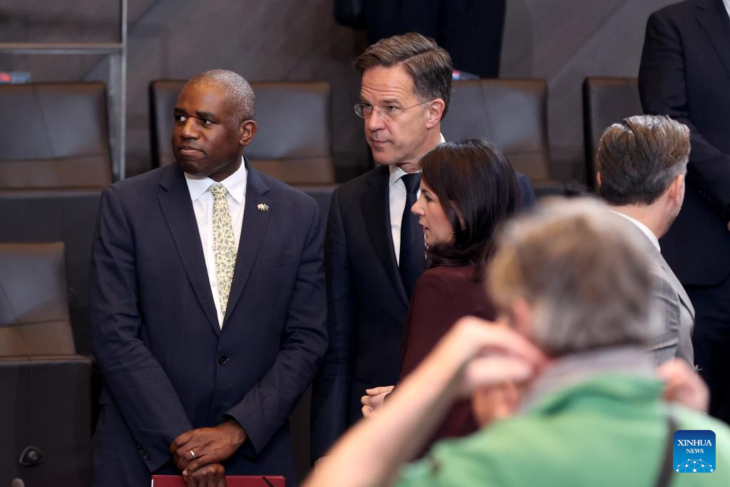 O secretário das Relações Exteriores britânico, David Lammy (1º, à esquerda), o secretário-geral da Organização do Tratado do Atlântico Norte (OTAN), Mark Rutte (2º, à esquerda), e a ministra das Relações Exteriores alemã, Annalena Baerbock, são vistos antes de reunião de ministros das Relações Exteriores da OTAN na sede da OTAN em Bruxelas, Bélgica, no dia 4 de abril de 2025. (Xinhua/Zhao Dingzhe)