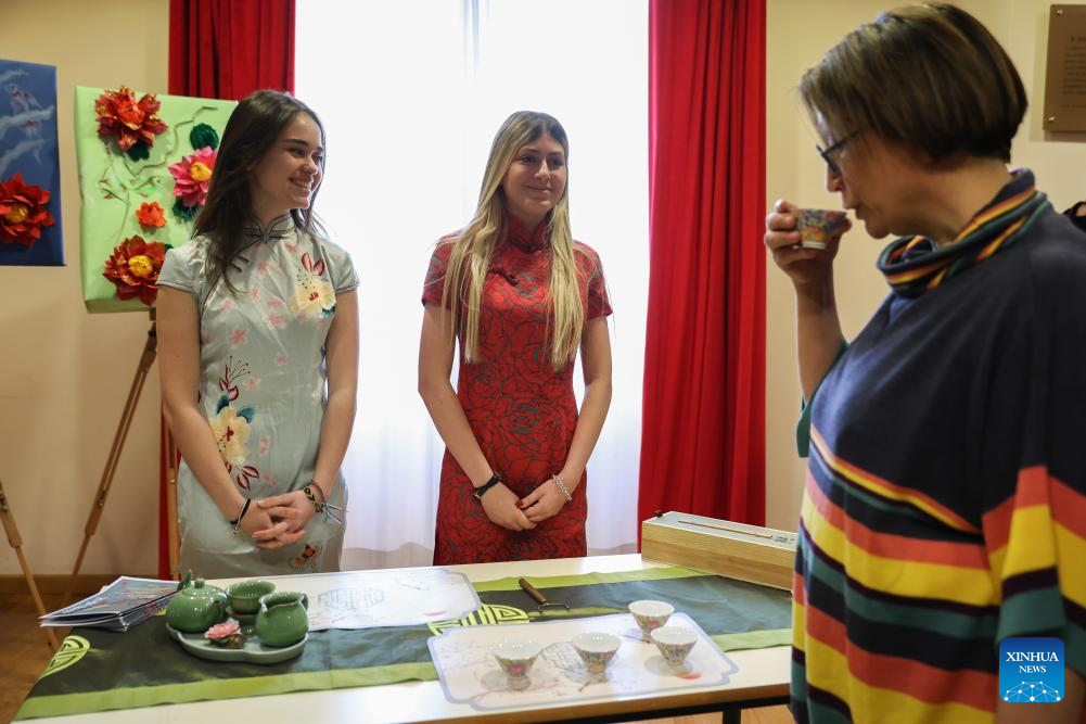 Estudantes demonstram arte do chá chinês em evento cultural chinês chamado "Celebrando a Primavera" em Roma, Itália, no dia 8 de abril de 2025. Dezenas de estudantes italianos em um internato em Roma demonstraram sua paixão pela língua e cultura chinesas por meio de várias apresentações na terça-feira. (Xinhua/Li Jing)