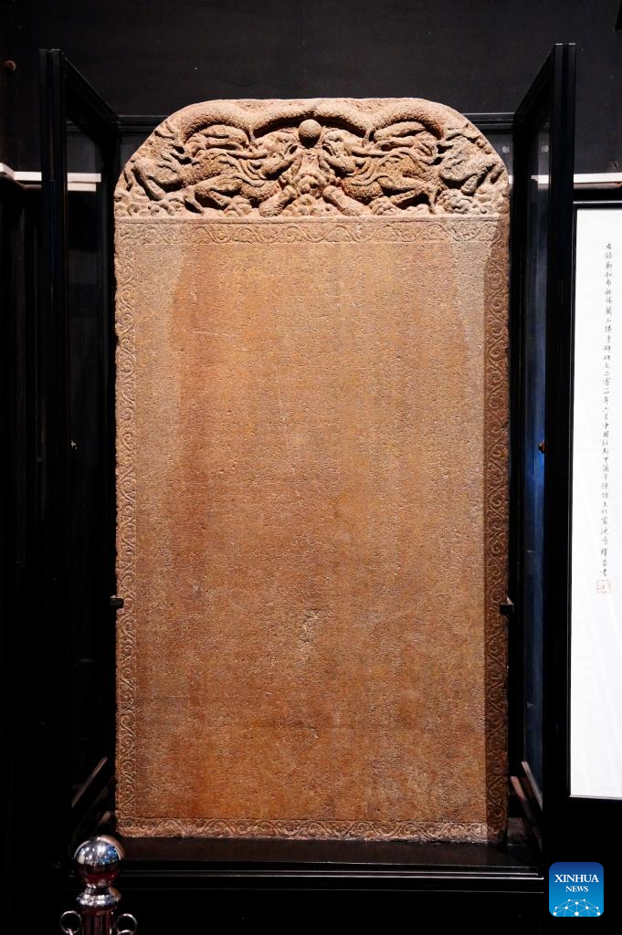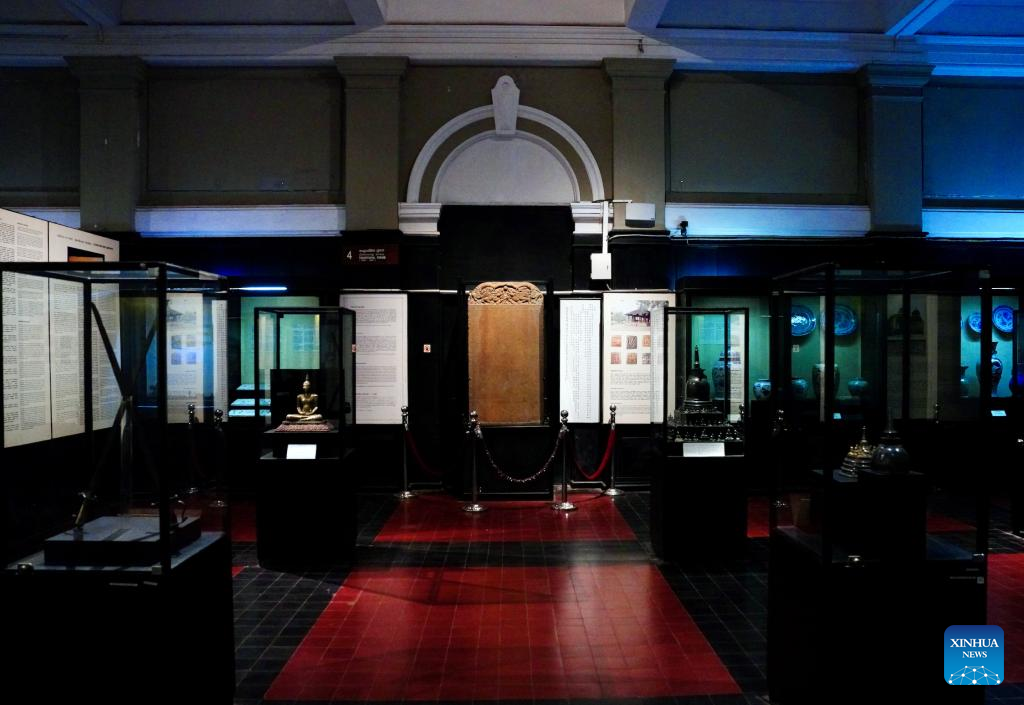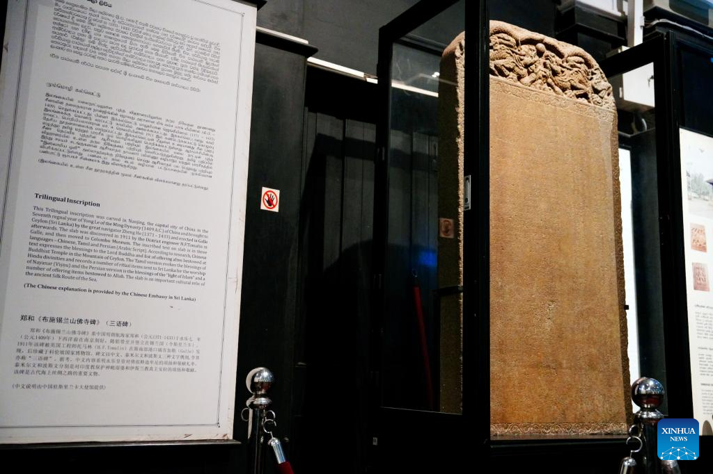Foto tirada no dia 17 de abril de 2025 mostra Inscrição Trilíngue (centro) no Museu Nacional de Colombo, em Colombo, Sri Lanka. Três coleções do patrimônio documental enviadas pela China foram inscritas no Registro da Memória do Mundo da UNESCO, anunciou a Organização das Nações Unidas para a Educação, a Ciência e a Cultura (ONU) na quinta-feira.