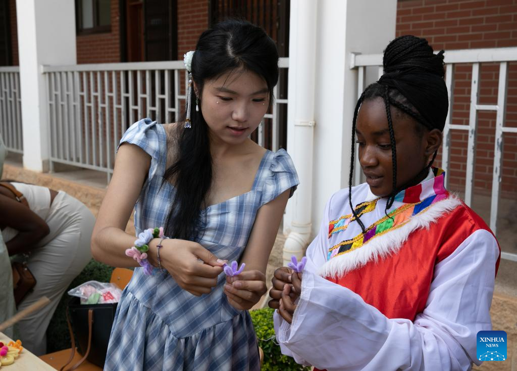 Professora do Instituto Confúcio da Universidade da Zâmbia ensina estudante a fazer acessórios em Lusaca, Zâmbia, no dia 16 de abril de 2025. O Instituto Confúcio da Universidade da Zâmbia (UNZA) fez comemorações na quarta-feira para marcar o Dia Internacional da Língua Chinesa 2025. (Xinhua/Peng Lijun)