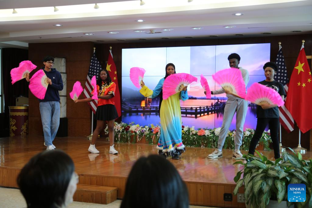 Estudantes apresentam uma dança de leque durante um evento de celebração do Dia da Língua Chinesa em Nova York, Estados Unidos, 25 de abril de 2025. Mais de 200 estudantes e educadores de Nova York, Nova Jersey e Connecticut comemoraram o Dia da Língua Chinesa em um evento temático organizado nesta sexta-feira pelo Consulado Geral da China em Nova York. O evento de portas abertas teve um clima animado e festivo, com os alunos compartilhando experiências em suas viagens à China, apresentando performances sobre a cultura tradicional chinesa e participando de atividades culturais práticas, como caligrafia, pintura com açúcar, teatro de fantoches, experimentação de trajes hanfu e artesanato tradicional. (Xinhua/Liu Yanan)