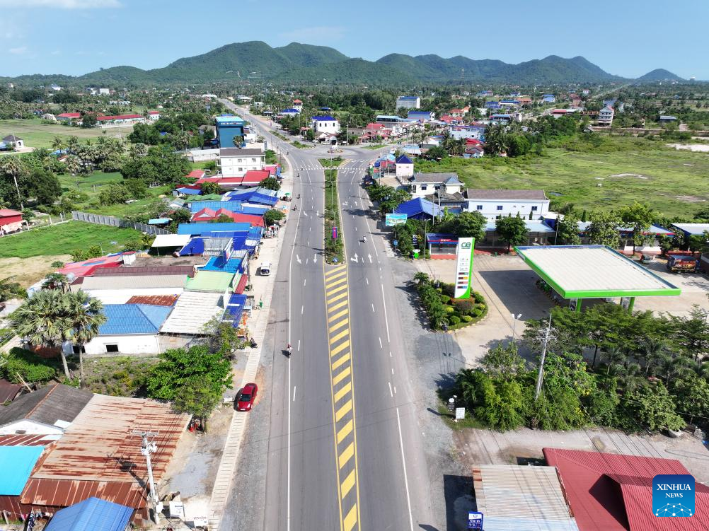 Foto aérea de drone tirada no dia 22 de abril de 2025 mostra Estrada Nacional 31, financiada pela China, na província de Kampot, Camboja. (Foto por Nitola/Xinhua)