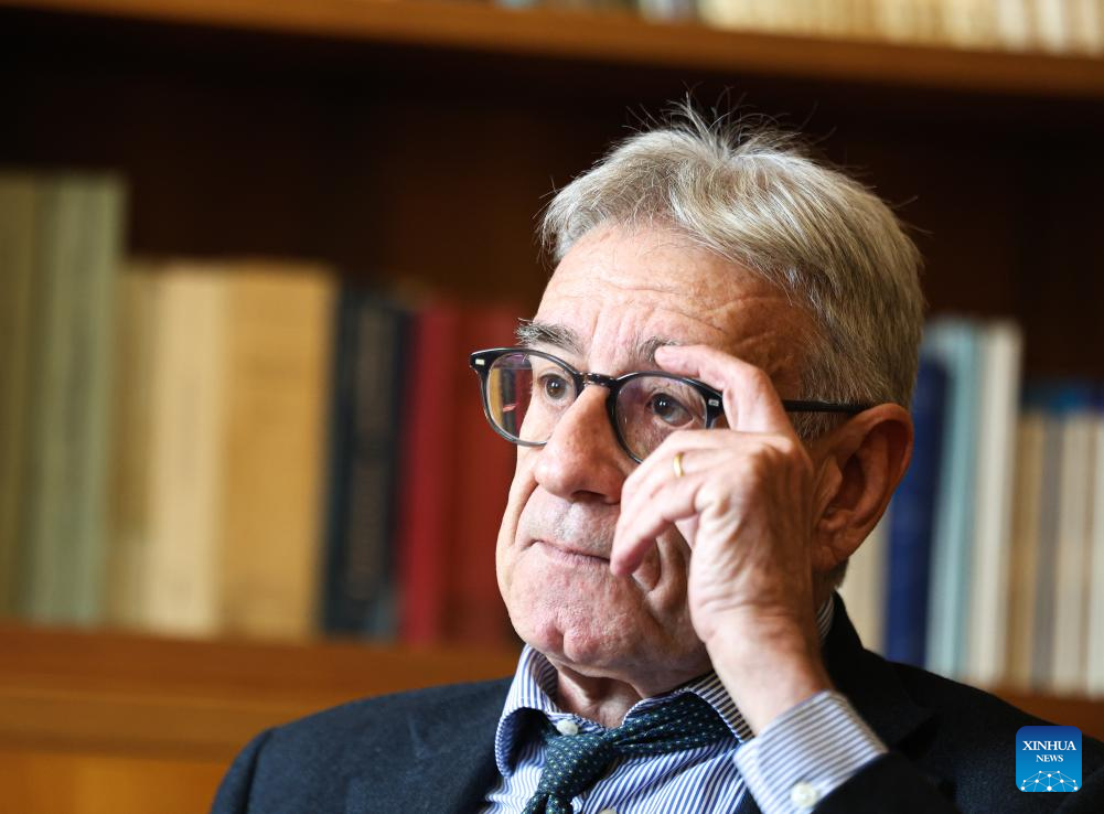 O professor Oliviero Diliberto, reitor da Faculdade de Direito da Universidade Sapienza de Roma, reage em entrevista à Xinhua em seu escritório na Universidade Sapienza de Roma, Itália, no dia 23 de abril de 2025. (Xinhua/Li Jing)
