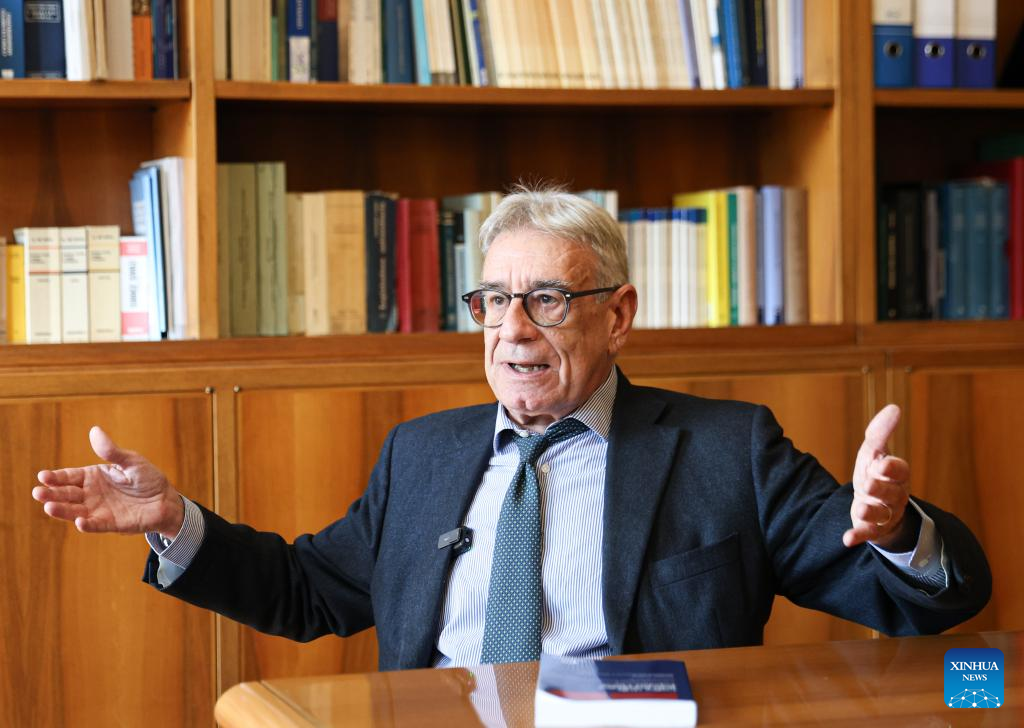 O professor Oliviero Diliberto, reitor da Faculdade de Direito da Universidade Sapienza de Roma, fala em entrevista à Xinhua em seu escritório na Universidade Sapienza de Roma, Itália, no dia 23 de abril de 2025. (Xinhua/Li Jing)