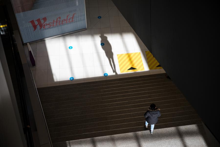 Pedestre desce escadas do Westfield World Trade Center em Nova York, Estados Unidos. (Foto por Michael Nagle/Xinhua)