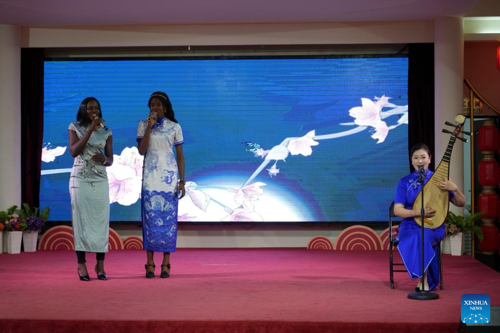 Artistas chinesa e nigerianas se apresentam juntos no Centro Cultural da China em Abuja, Nigéria, 11 de maio de 2025. Dezenas de nigerianos em Abuja ficaram encantados no domingo, enquanto um grupo visitante de artistas do sul da China os entretinha e os apresentava ao Pingtan, uma cativante forma de arte tradicional chinesa que combina magistralmente a narrativa com instrumentos musicais, utilizando adereços simples para aprimorar a apresentação. (Xinhua/Yang Zhe)