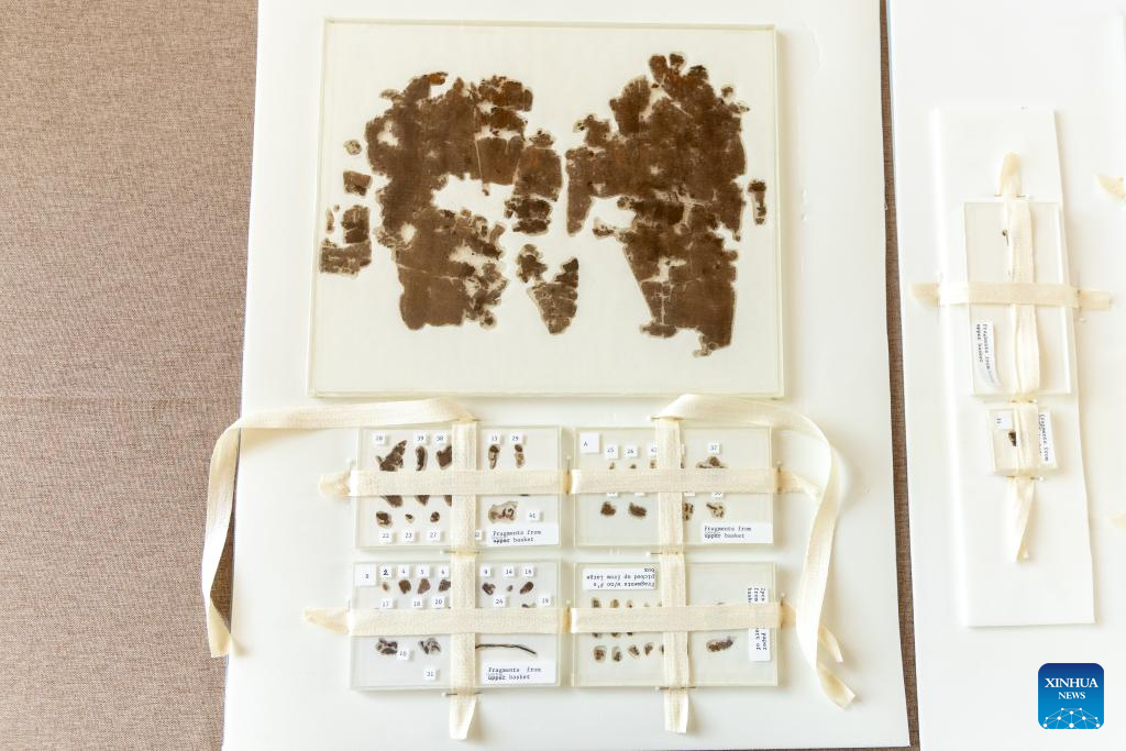 Antigos Manuscritos de Seda de Zidanku do período dos Estados Combatentes são exibidos durante cerimônia de entrega na Embaixada Chinesa nos Estados Unidos em Washington, D.C., no dia 16 de maio de 2025. (Xinhua/Hu Yousong)