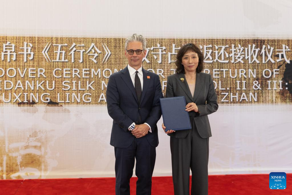 Washington, 16 mai (Xinhua) -- O Museu Nacional de Arte Asiática do Smithsonian devolveu oficialmente na sexta-feira os volumes 2 e 3 do Manuscrito de Seda de Zidanku: Wuxing Ling e Gongshou Zhan, do período dos Estados Combatentes, para a Administração Nacional do Patrimônio Cultural da China.