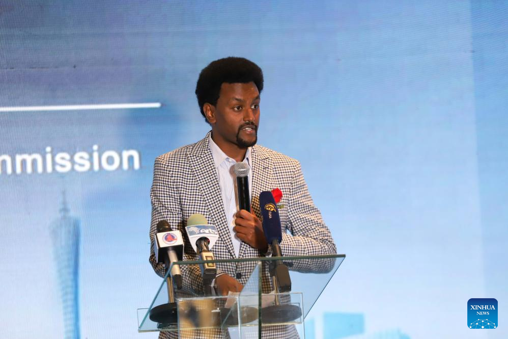 Zeleke Temesgen, comissário da Comissão de Investimentos da Etiópia, fala em um evento de lançamento da marca organizado pela montadora chinesa Guangzhou Automobile Group Co., Ltd (GAC Group) em Adis Abeba, capital da Etiópia, em 17 de maio de 2025. A montadora chinesa Guangzhou Automobile Group Co., Ltd (GAC Group) apresentou dois de seus modelos de veículos elétricos (EV) ao mercado etíope, marcando a entrada da marca chinesa no país da África Oriental. (Xinhua/Michael Tewelde)