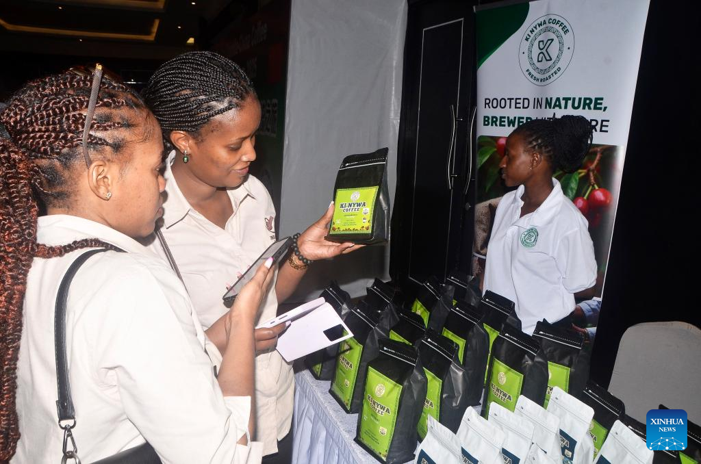 Visitante olha produto de café na Conferência sobre Comércio e Investimento em Café entre Uganda e China, em Campala, Uganda, no dia 20 de maio de 2025. Uma delegação de investidores chineses está visitando Uganda para estabelecer laços comerciais com cafeicultores locais, conforme a demanda pela cultura comercial aumenta no mercado chinês em rápida expansão. (Foto por Nicholas Kajoba/Xinhua)