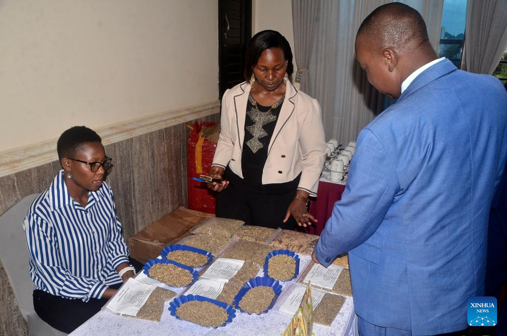 Visitantes conhecem produto de café na Conferência sobre Comércio e Investimento em Café entre Uganda e China, em Campala, Uganda, no dia 20 de maio de 2025. Uma delegação de investidores chineses está visitando Uganda para estabelecer laços comerciais com cafeicultores locais, conforme a demanda pela cultura comercial aumenta no mercado chinês em rápida expansão. (Foto por Nicholas Kajoba/Xinhua)
