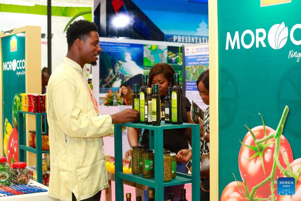 Visitante conhece produtos em estande marroquino na 7ª edição da Exposição Internacional da Agricultura e dos Recursos Animais (SARA 2025) no Centro de Exposições de Abidjan, Abidjan, Costa do Marfim, no dia 23 de maio de 2025. (Foto por Laurent Idibouo/Xinhua)