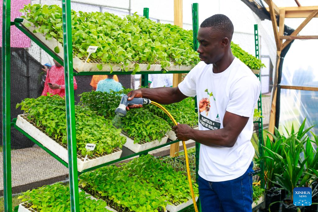 Funcionário rega mudas de hortaliças na 7ª edição da Exposição Internacional de Agricultura e dos Recursos Animais (SARA 2025) no Centro de Exposições de Abidjan, Abidjan, Costa do Marfim, no dia 23 de maio de 2025. (Foto por Laurent Idibouo/Xinhua)