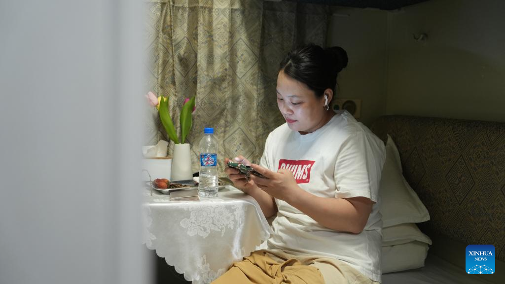 A passageira chinesa Tang Piao viaja no trem internacional China-Vietnã de Hanói, Vietnã, com destino a Nanning, China, em 26 de maio de 2025. (Foto por Dang Hong Dung/Xinhua)