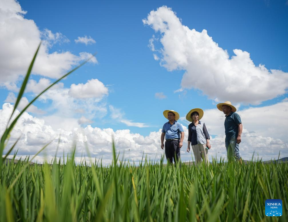 Especialistas agrícolas chineses observam crescimento do arroz híbrido em Mahitsy, Madagascar, no dia 25 de março de 2025. (Xinhua/Li Yahui)