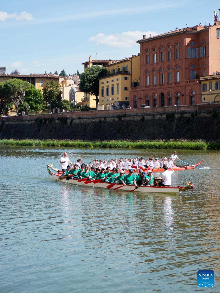 Florença, Itália, 2 jun (Xinhua) -- Tendo como pano de fundo o horizonte renascentista de Florença, a batida rítmica dos tambores de três barcos do dragão correndo no Rio Arno atraiu multidões ao longo das margens, marcando uma celebração vibrante do tradicional Festival de Barcos do Dragão da China.