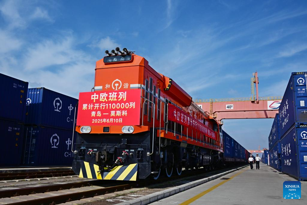 Jinan, 10 jun (Xinhua) -- O 110.000º trem de carga China-Europa partiu de Qingdao, na Província de Shandong, leste da China, na manhã desta terça-feira, estabelecendo um marco no desenvolvimento de alta qualidade do serviço.