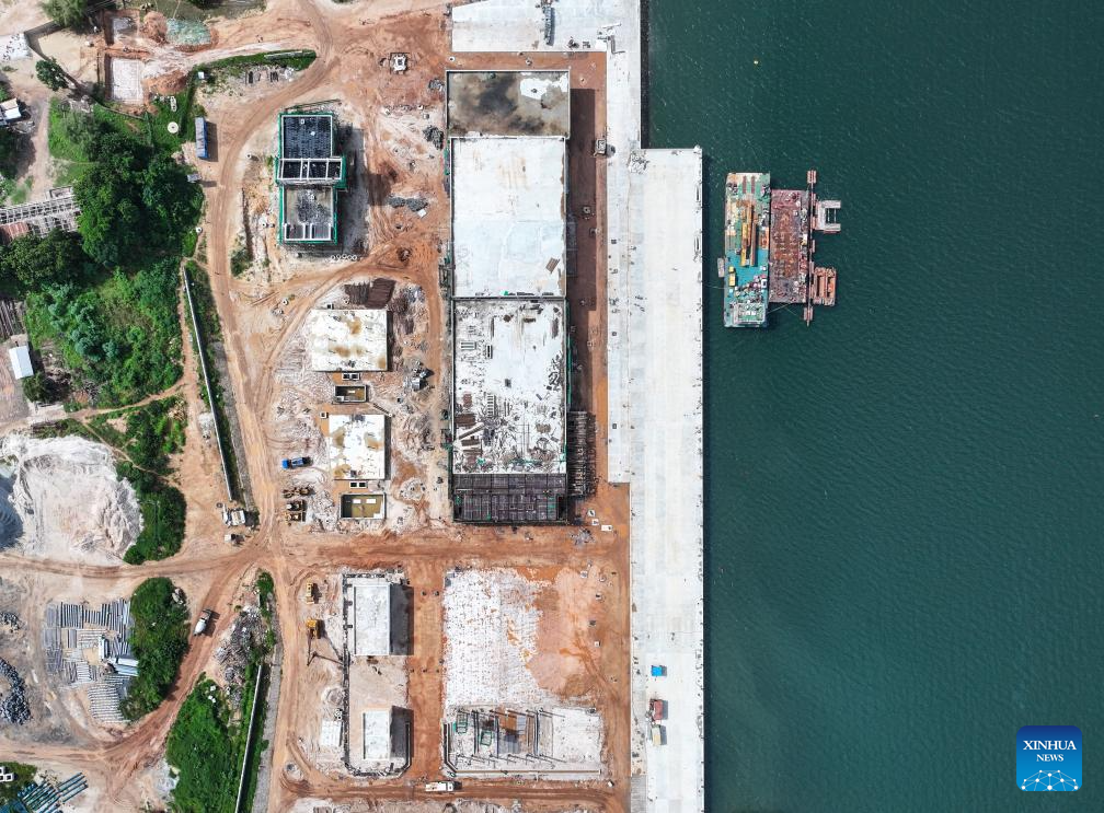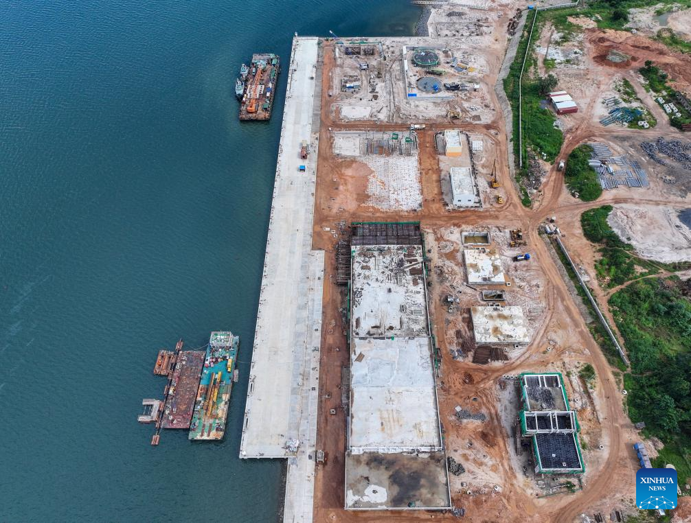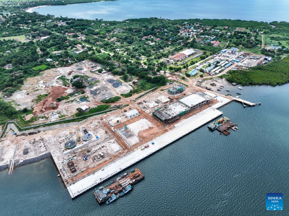Foto aérea tirada com drone em 23 de abril de 2025 mostra o Porto de Pesca de Kilwa em construção perto de Kilwa Kisiwani, na Tanzânia. O projeto, construído pela China Harbor Engineering Company Ltd (CHEC), uma importante construtora chinesa, é o primeiro porto de pesca moderno de grande porte da Tanzânia. Com cerca de 5,6 hectares, ele foi projetado para receber 60.000 toneladas de peixes anualmente e pode atracar embarcações de pesca em alto mar, de acordo com Chen Zhifeng, vice-gerente de projetos do departamento de projetos marítimos da CHEC Tanzânia. (Xinhua/Li Yahui)