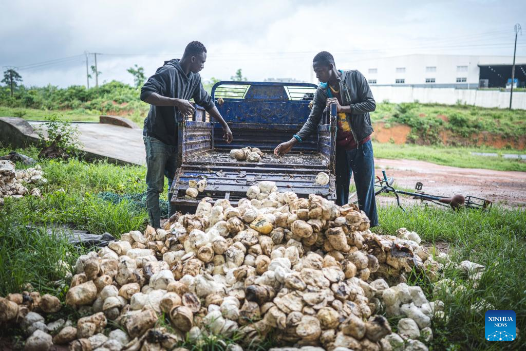 Abidjan, 14 jun (Xinhua) -- Ao amanhecer em Grand-Bereby, uma cidade no departamento de San Pedro, no sudoeste da Costa do Marfim, carroças de três rodas carregadas com látex branco leitoso serpenteiam por exuberantes plantações de borracha, rumo a uma fábrica novinha em folha construída por uma empresa chinesa.