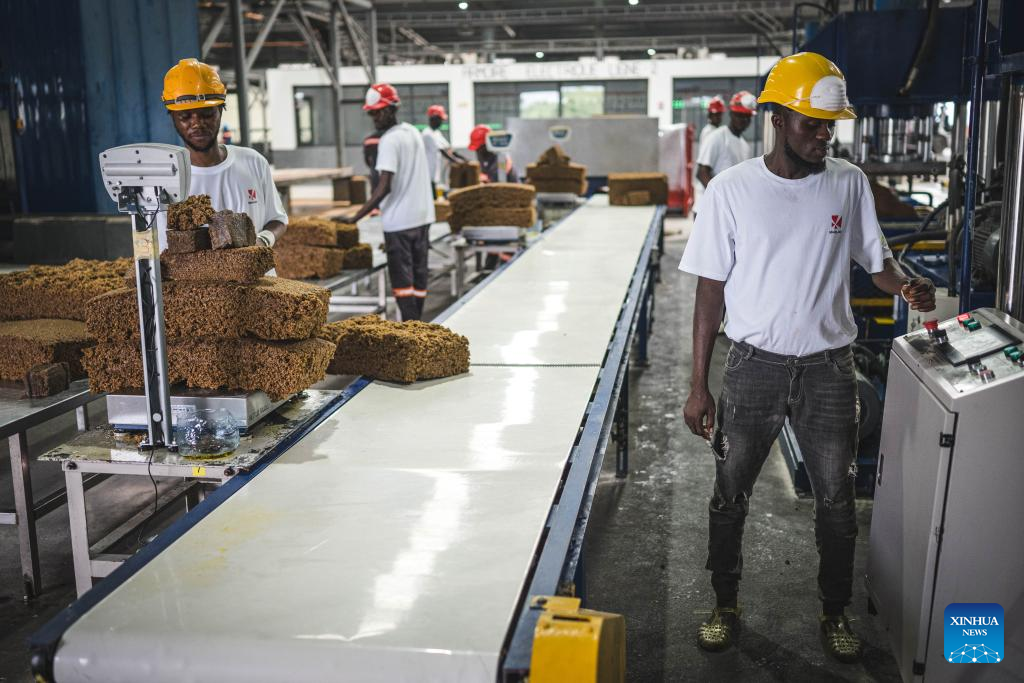 Trabalhadores organizam blocos de borracha na fábrica de processamento de borracha de uma empresa chinesa em Grand-Bereby, Costa do Marfim, no dia 29 de maio de 2025. (Xinhua/Wang Guansen)
