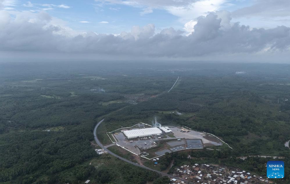 Foto aérea tirada em 30 de maio de 2025 mostra fábrica de processamento de borracha de uma empresa chinesa em Grand-Bereby, Costa do Marfim. (Xinhua/Wang Guansen)