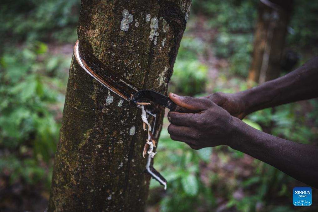 Seringueiro colhe borracha em plantação em Grand-Bereby, Costa do Marfim, no dia 30 de maio de 2025. (Xinhua/Wang Guansen)
