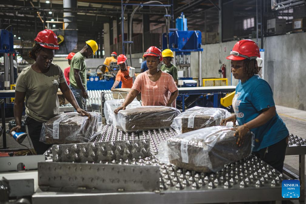 Trabalhadores embalam blocos de borracha na fábrica de processamento de borracha de uma empresa chinesa em Grand-Bereby, Costa do Marfim, no dia 29 de maio de 2025. (Xinhua/Wang Guansen)