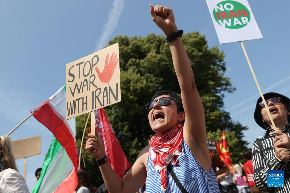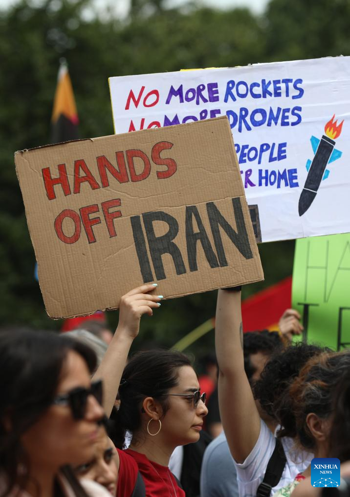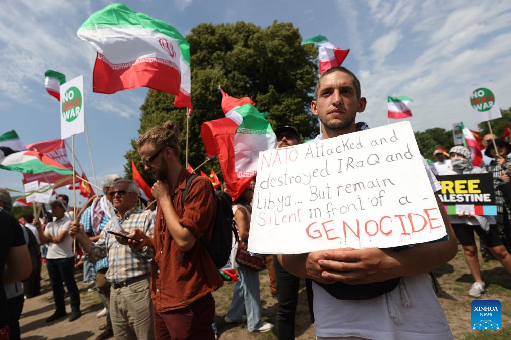 Manifestantes segurando faixas e cartazes são fotografados em Haia, Holanda, em 22 de junho de 2025. (Xinhua/Zhao Dingzhe)