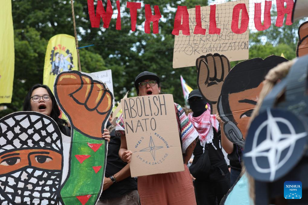 O protesto, que contou com a participação de centenas de pessoas, ocorreu dois dias antes da reunião de cúpula da OTAN, na qual se espera que os Estados-membros pressionem por maiores gastos com defesa. Embora a manifestação tenha sido anunciada como uma oposição à OTAN e à guerra em Gaza, ela também atraiu participantes com faixas que diziam "Não à Guerra do Irã", após os ataques aéreos dos EUA a três instalações nucleares iranianas no dia anterior.