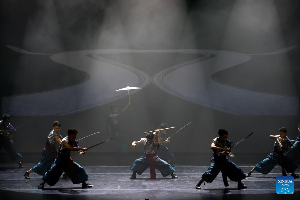 Integrantes do Grupo de Artes Marciais Longyun em apresentação especial de dança dramática de kung fu chinês "11 Guerreiros" na Ópera Nacional de Bucareste, em comemoração ao Dia Internacional do Diálogo entre Civilizações em Bucareste, Romênia, no dia 28 de junho de 2025. Organizado pela Embaixada da China na Romênia, pelo Centro Cultural Chinês de Bucareste e pela Casa Romênia-China, o evento atraiu mais de 900 participantes, incluindo diplomatas, autoridades culturais e figuras públicas. A apresentação foi feita pelo Grupo de Artes Marciais Longyun, fundado pelo renomado astro do cinema chinês Jackie Chan. Combinando artes marciais, dança moderna e multimídia, a produção traça a evolução do kung fu chinês, desde suas origens no combate até sua profundidade filosófica e espiritual. (Foto por Cristian Cristel/Xinhua)