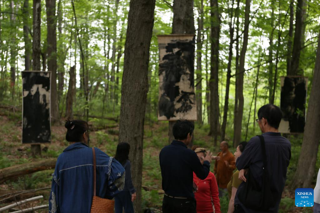 Pessoas visitam a exposição ao ar livre "Termos Solares: Evento de Arte Contemporânea com Tinta" em Lenox, Massachusetts, Estados Unidos, no dia 28 de junho de 2025. Em um canto arborizado do Eastover Estate & Eco-Village, uma dúzia de pergaminhos altos, com aproximadamente um metro de largura e três metros de altura, balançam silenciosamente ao vento do verão, visivelmente transformados pela chuva, neve, luz solar e tempo desde que foram instalados há um ano. Os pergaminhos foram pintados em papel de arroz, fixados em um tecido não tecido durável e, depois, emoldurados e suspensos entre árvores na floresta do estado americano de Massachusetts. (Xinhua/Zhang Fengguo)