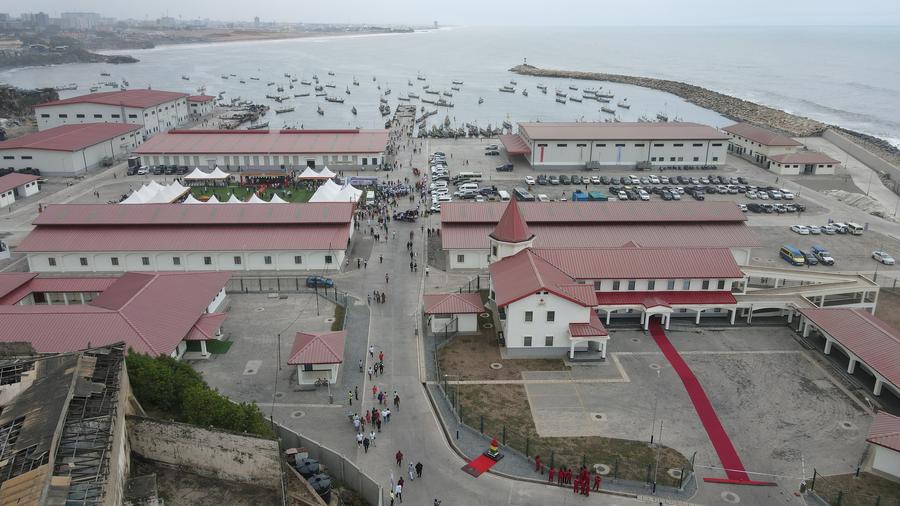 Foto aérea de drone tirada em 13 de setembro de 2024 mostra vista do Complexo Portuário de Pesca de Jamestown, apoiado pela China, em Acra, Gana. (Foto por Seth/Xinhua)
