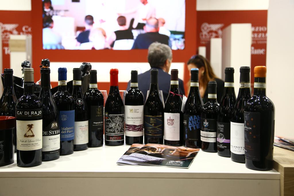 Garrafas de vinho em exposição na feira internacional de vinhos e destilados Vinitaly, em Verona, Itália, no dia 9 de abril de 2025. JUNTO COM "Destaque: Tarifas de Trump causam gosto amargo entre produtores de vinho italianos" (Xinhua)